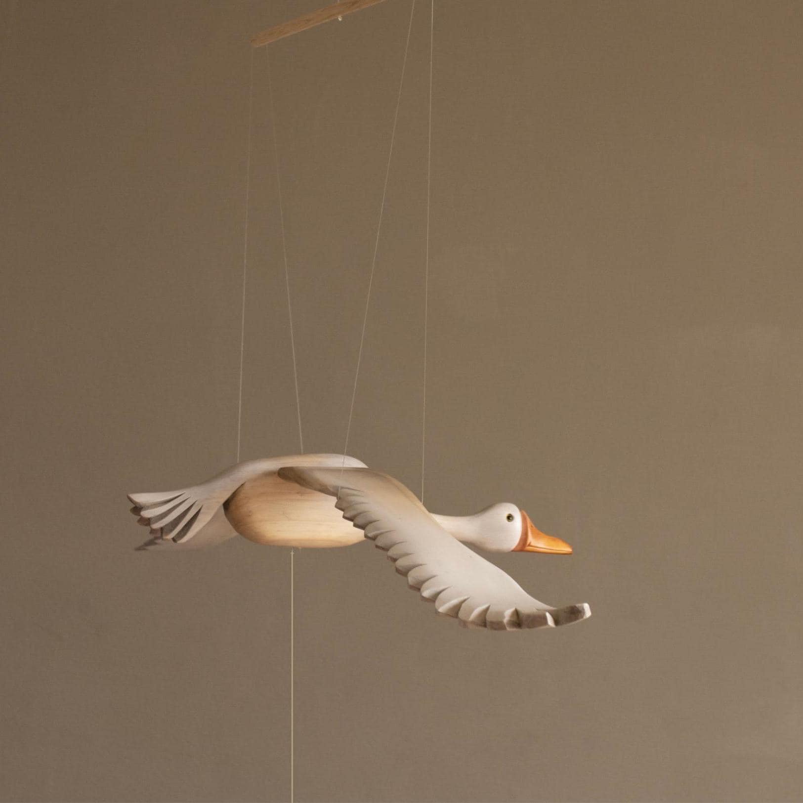 The Grey Goose has a particularly soft and friendly quiet presence making it ideal as a nursery mobile. It's lovely over a crib where the rhythmic motion can help to sooth baby to sleep.