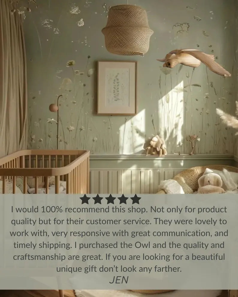 Owls are ancient symbols of wisdom, protection, and quiet strength. This mobile captures that essence, offering not just a decorative piece but a reassuring presence in your home. Both sculptural and interactive, it is crafted to inspire calm, curiosity, and joy for years to come.