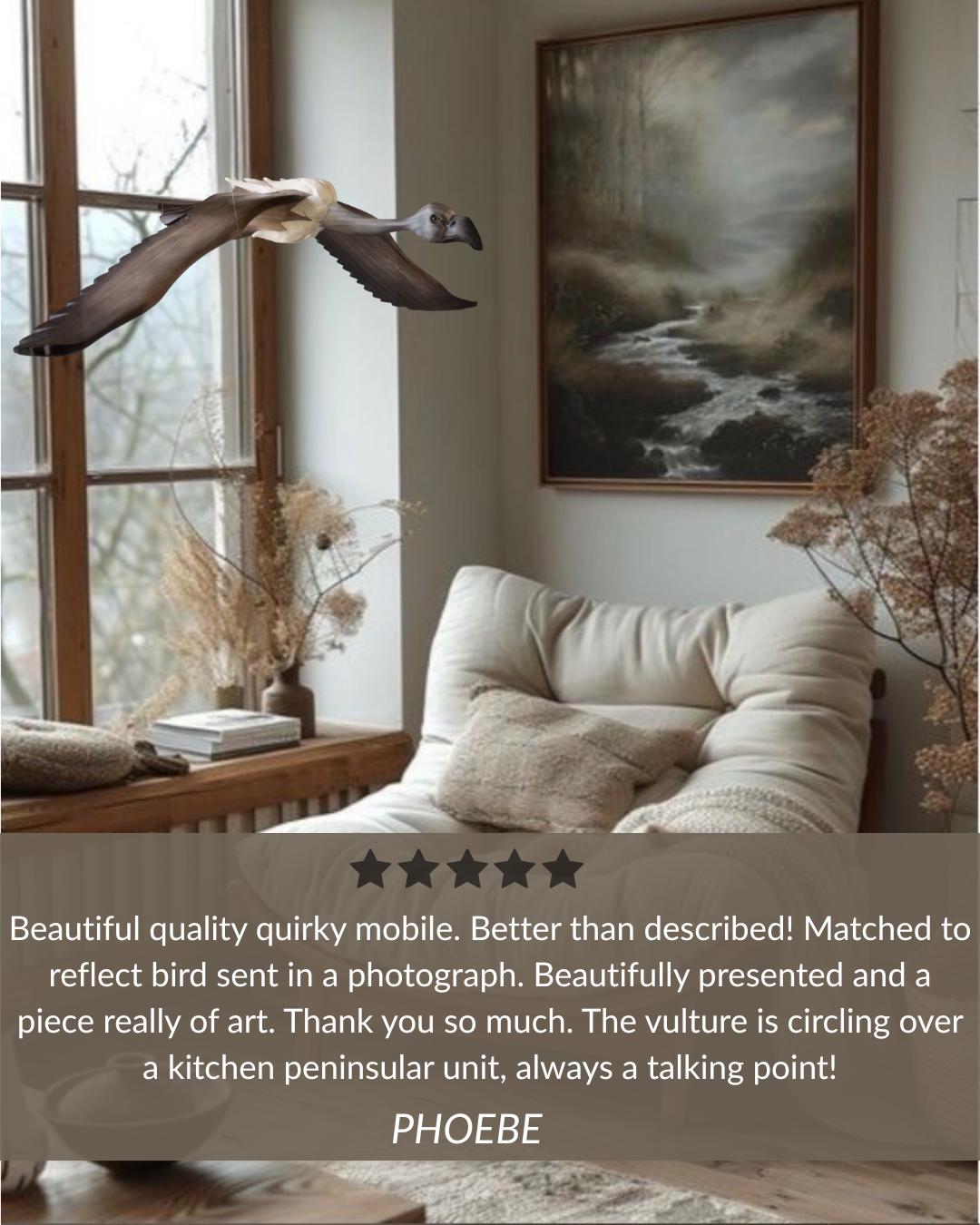 The Vulture embodies quiet strength and resilience — a creature of balance and grace, soaring on unseen currents. This mobile honours that spirit, blending raw natural beauty with timeless craftsmanship to create a piece that feels alive, serene, and full of presence.